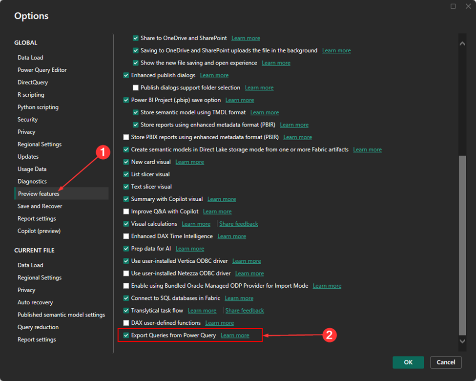1. Go to File → Options → Preview Features → Export Queries from Power Query.
