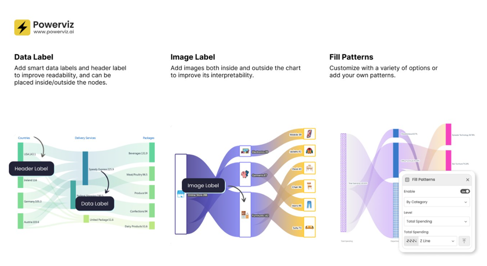 Flow your data like never before. The Sankey Chart visual adds vertical/horizontal orientations, multi-level support, color-blind palettes, conditional formatting, and even image labels. Perfect for customer journeys, expense flows, and supply chains.